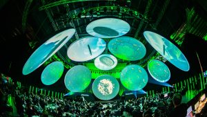 Eleven round screens, seven with an 8m diameter and four with a 6m diameter, created an immersive 360-degree environment. The Kuka robot stole the show with their musical and dance performances. Sturdy and secure structures supported the technical setup, while minimalist, transparent black furniture seamlessly blended into the IRGAwards aesthetics.