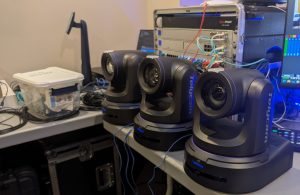 The Telycam PTZ cameras output NDI HX3 streams, which were transported to the production room over an Ubiquiti network with 10Gbps fiber connectivity. The production center housed four space-efficient operator stations: the main switcher system running vMix software; two camera operator positions; and a graphics and audio station featuring Singular Live HTML5 graphics and a Behringer X32 mixing console.